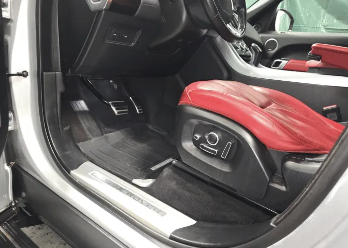 För den invändiga behandlingen börjar vi med en grov dammsugning av samtliga ytor. Kupén rengörs och vi använder lufttryck för att fräscha upp hela interiören. Vi tar bort enstaka fläckar och rengör instrumentbrädan för att den ska se ut som ny. Slutligen putsar vi fönstren invändigt för att säkerställa en klar och ren insida.